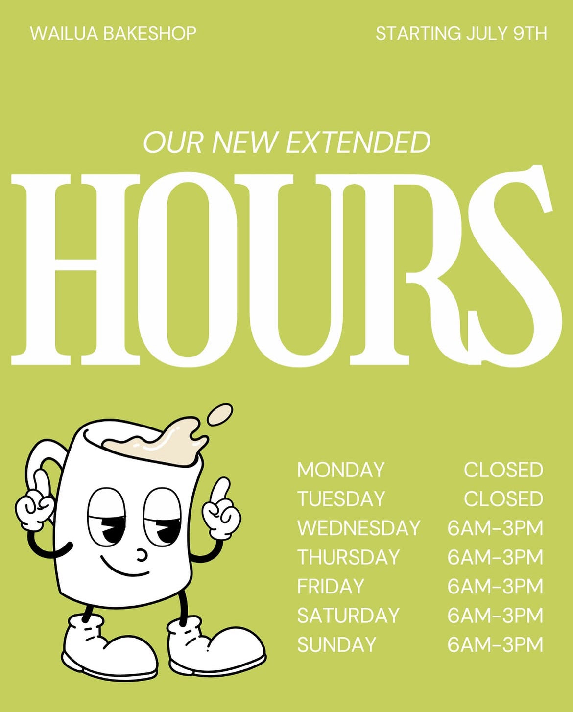 Starting July 9th we'll be open Wednesday through Sunday, 6am - 3pm 🎉💚